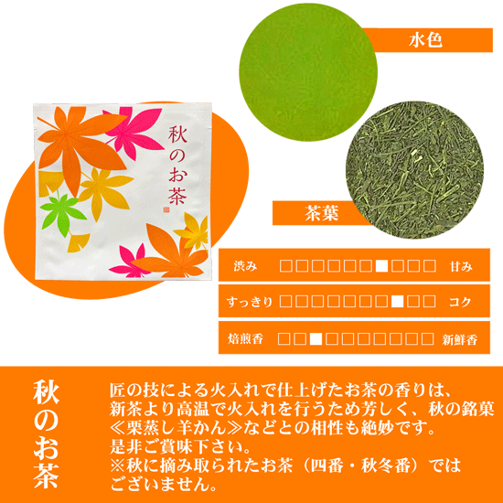 秋の味覚に合うように、味わい深く、角のとれたまるいお茶に仕上げました。ぜひ、ご賞味ください。