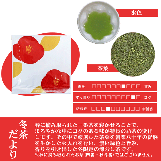 その中で厳選した茶葉を、創業七十七年の経験を活かした火入れを行い、濃い緑色と旨みを引き出し香りを際立たせた冬季限定の深むし茶です。