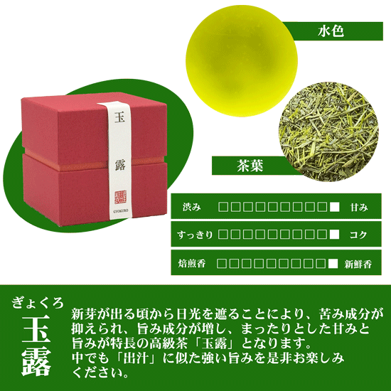 新芽が出る頃から日光を遮ることにより、苦み成分が抑えられ、旨み成分が増し、まったりとした甘みと旨みが特長の高級茶「玉露」となります。